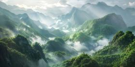 Panoramic view of misty mountains and lush green valleys - Ai Generated