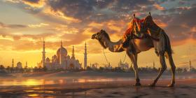 Eid ul-Adha Greetings: Camel and Mosque, Eid ul-Adha Celebration: Camel Against Mosque Backdrop - Ai Generated
