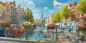 Amsterdam canals with bicycles and colorful houses background - Ai Generated