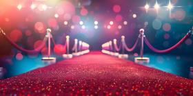 Beautiful Red carpet rolling out in front of glamorous movie premiere background - Ai Generated
