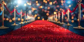 Beautiful Red carpet rolling out in front of glamorous movie premiere background - Ai Generated
