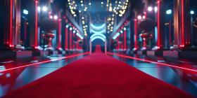 Beautiful Red carpet rolling out in front of glamorous movie premiere background - Ai Generated