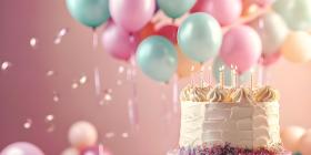 Birthday party balloons with cake with copy space for text - Ai Generated