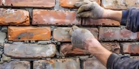 Bricklayer worker installing brick masonry on exterior wall background - Ai Generated