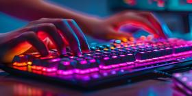 Working on a neon computer keyboard with colored backlighting background - Ai Generated