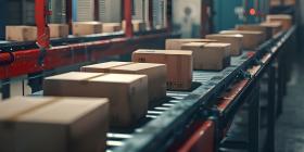 Multiple cardboard box packages seamlessly moving along a conveyor belt in a warehouse