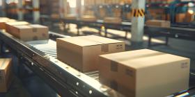 Multiple cardboard box packages seamlessly moving along a conveyor belt in a warehouse