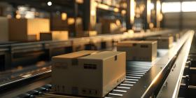 Multiple cardboard box packages seamlessly moving along a conveyor belt in a warehouse