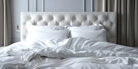 Comfortable bed with soft white pillows and bedding in bed background - Ai Generated