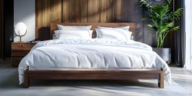 Comfortable bed with soft white pillows and bedding in bed background - Ai Generated