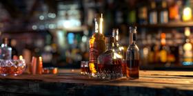 Different bitters and liqueurs on table in bar background - Ai Generated