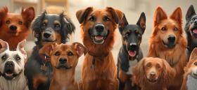 Dogs of different breeds happily gathered together and looking at camera background, - Ai Generated