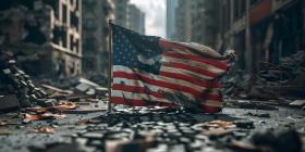 Fallen American flag against the background of destroyed skyscrapers background - Ai Generated