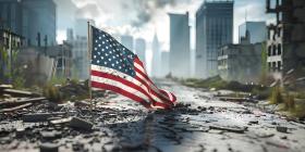 Fallen American flag against the background of destroyed skyscrapers background - Ai Generated