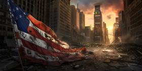 Fallen American flag against the background of destroyed skyscrapers background - Ai Generated
