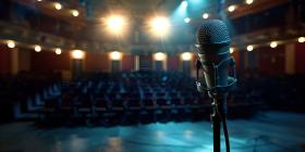 Microphone on a stand is highlighted by a spotlight against a blurred background of an auditorium - Ai Generated