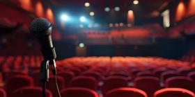 Microphone on a stand is highlighted by a spotlight against a blurred background of an auditorium - Ai Generated