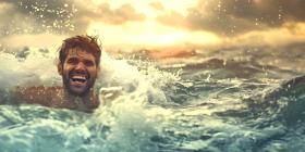 Man is coming up out of the water while smiling background - Ai Generated