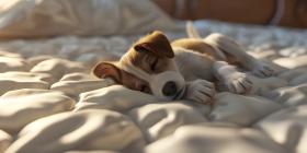 Puppy is sleeping on white mattress hotel room - Ai Generated