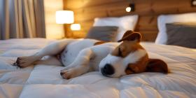 Puppy is sleeping on white mattress hotel room - Ai Generated