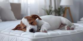 Puppy is sleeping on white mattress hotel room - Ai Generated