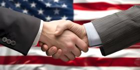 Shaking hands near flag of America background - Ai Generated