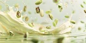 Pistachio falling on a layer of white hot chocolate background - Ai Generated