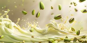Pistachio falling on a layer of white hot chocolate background - Ai Generated