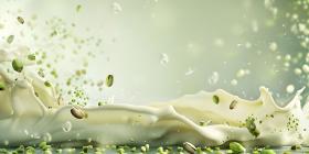 Pistachio falling on a layer of white hot chocolate background - Ai Generated
