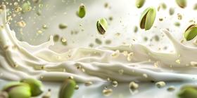 Pistachio falling on a layer of white hot chocolate background - Ai Generated
