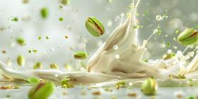 Pistachio falling on a layer of white hot chocolate background - Ai Generated