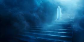 Spooky staircase with fog and a glowing ghostly apparition background - Ai Generated