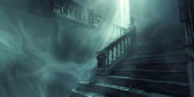 Spooky staircase with fog and a glowing ghostly apparition background - Ai Generated