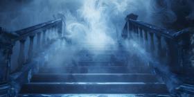Spooky staircase with fog and a glowing ghostly apparition background - Ai Generated