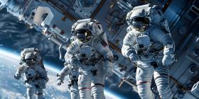 Team of astronauts in a space suits aboard the orbital station background - Ai Generated