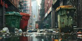 Trash cans polluting a street in the city background - Ai Generated
