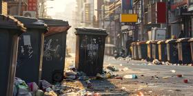Trash cans polluting a street in the city background - Ai Generated