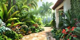 Tropical house with many plants background - Ai Generated