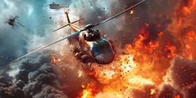 Helicopter Crash with Burning Wreckage Background, Fiery Helicopter Crash and Falling Debris Background - Ai Generated