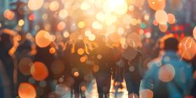 Blurred crowd of unrecognizable at the street at sunset background - Ai Generated