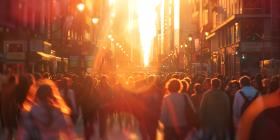 Blurred crowd of unrecognizable at the street at sunset background - Ai Generated