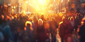 Blurred crowd of unrecognizable at the street at sunset background - Ai Generated