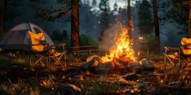 Bonfire with burning firewood near chairs and camping tent in forest background - Ai Generated