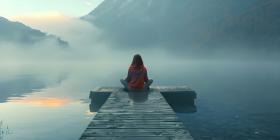 Calm morning meditation by the lake as Young woman sitting outdoors on the pier background - Ai Generated