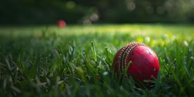 Red Cricket Ball Closeup on Green Grass Background, Green Grass Background with Closeup of Red Cricket Ball - Ai Generated