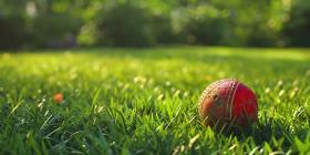 Red Cricket Ball Closeup on Green Grass Background, Green Grass Background with Closeup of Red Cricket Ball - Ai Generated