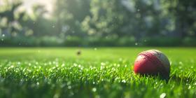 Red Cricket Ball Closeup on Green Grass Background, Green Grass Background with Closeup of Red Cricket Ball - Ai Generated