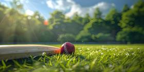 Cricket ball on the top of cricket bat on green grass of ground background - Ai Generated