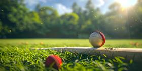Cricket ball on the top of cricket bat on green grass of ground background - Ai Generated