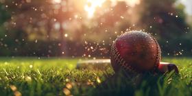 Cricket ball on the top of cricket bat on green grass of ground background - Ai Generated